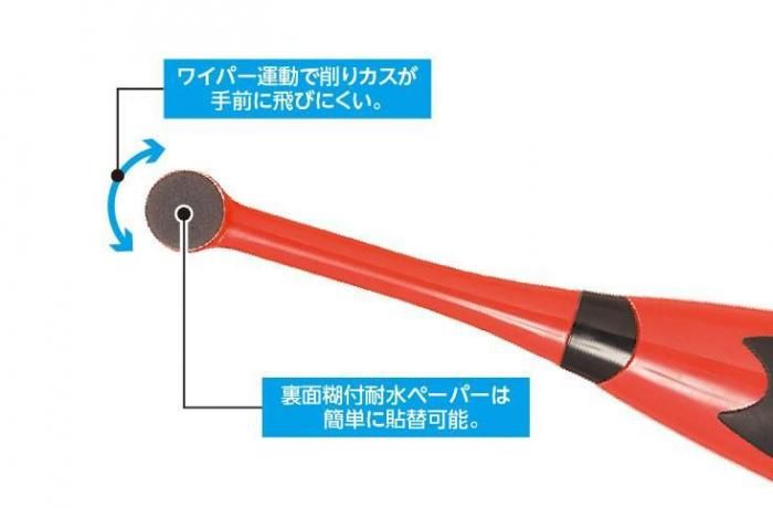 Gツール電動コードレスポリッシャーの上位機種です。付属の耐水ペーパーは、スポンジに貼り付けてあるので、力の入れ方次第で、微妙な削りが可能。曲面部分の作業にも適しています。