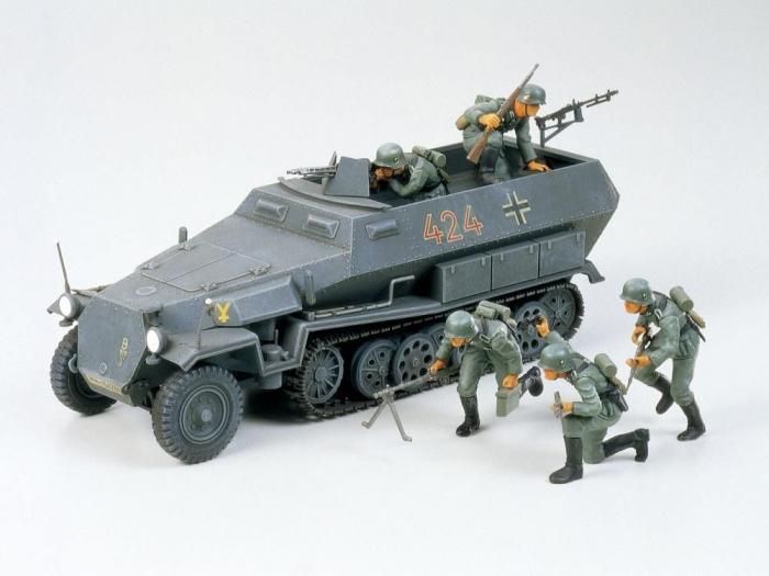第二次大戦中、ドイツ軍が多用したハーフトラック。その中でも優れた機動力を活かしてドイツ軍の快進撃を支えたSd.kfz.251/1ハノマーク兵員輸送車のプラスチックモデル組み立てキットです。タイヤとキャタピラを組み合わせたドイツらしいメカニカルなスタイルはもちろん、操縦席などオープントップの戦闘室内部まで精密に再現しました。車体後部のハッチは完成後も開閉することが可能。そしてダイナミックな動きの兵士の人形5体が、ハノマークの兵員輸送任務での活躍を演出します。