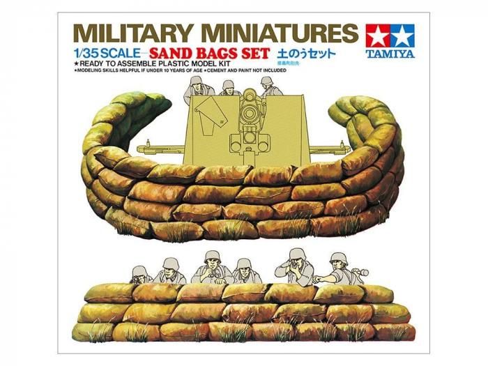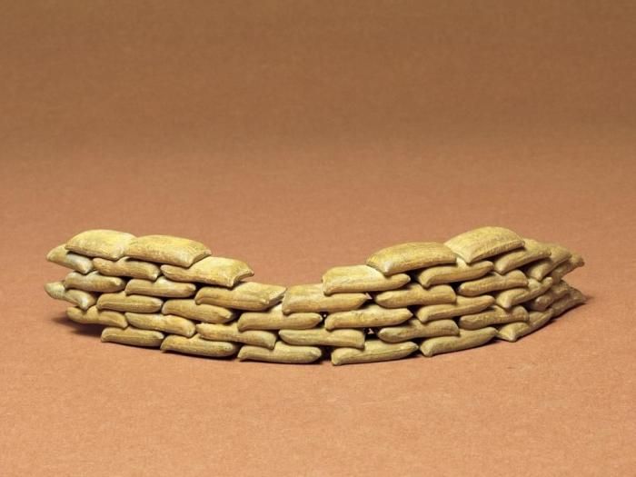 ミリタリーモデルの楽しみ方の一つが情景製作。この情景製作に便利に使えるのが土のうセットです。土を詰め込んだ布の袋で、積み重ねて対戦車砲や歩兵の陣地構築に使用。また戦車の前面などに積んで防御力を高める使い方もありました。キットは重みでつぶれた形の下積み用36個と上に積まれて四方が垂れ下がった状態の物12個をセットしました。対戦車砲や兵士の人形セットと組み合わせて情景が手軽に楽しめます。