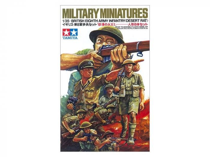 第二次大戦において、北アフリカの砂漠を舞台に、ドイツのロンメル将軍が率いるアフリカ軍団と激しい戦いをくり返し、連合軍のアフリカにおける勝利に大きな貢献を果たしたイギリス軍部隊、第8軍の兵士を再現したプラスチックモデル組み立てキットです。人形はすべて半ズボンをはいた熱帯地域用ユニフォーム姿。エンフィールド・ライフルをかかえて行軍中の兵士、ライフルをかかえて突撃する兵士がそれぞれ2体ずつ、左手で前方を指さす将校、立て膝で射撃姿勢の兵士、立ってライフルを構える立射姿勢の兵士、そしてM1短機関銃を構えて立ったまま射撃する兵士の8体をセットしました。