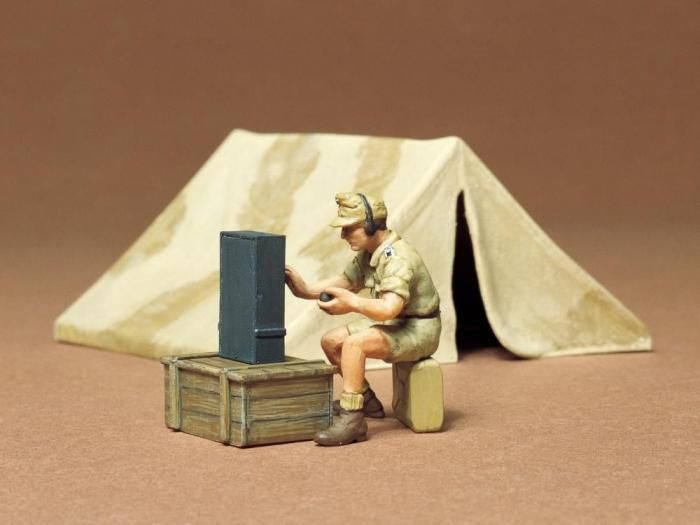 野営などに使われたテントを再現したプラスチックモデル組み立てキットです。テント1張りとドイツ軍通信兵の人形1体をセット。テントは三角形の一般的なもので、ドイツ軍のみならず連合軍でも使われました。入口は開けた状態と閉じた状態を選んで組み立てられます。ジェリカンに座って無線機を操作する兵士は、開襟シャツに半ズボン、野戦帽という北アフリカ戦線でよく見られたスタイルで再現しました。