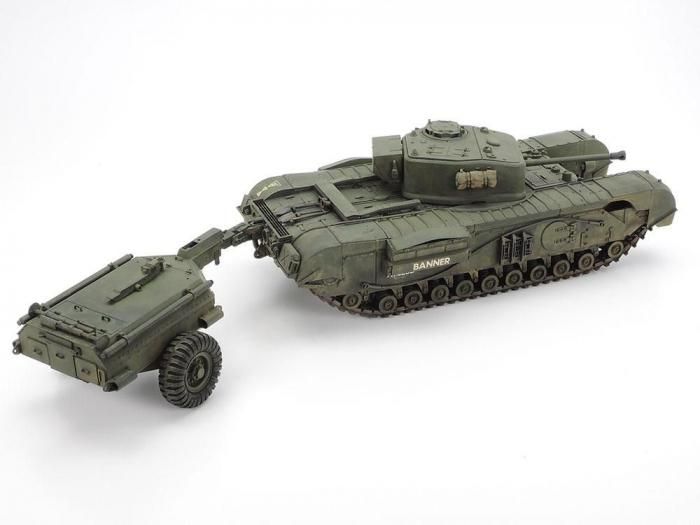 【 模型要目 】 第二次大戦中のイギリス軍の火炎放射戦車チャーチル・クロコダイルの1/35スケール、プラスチックモデル組立てキットです。 ●トレーラー連結時の全長約340mm。堂々とした姿を実感豊かにモデル化。 ●歩兵戦車チャーチルMk.VIIも選んで組立てられます。 ●車体とトレーラーのジョイント部分は上下左右に動かせます。 ●トレーラーの点検ハッチなどは開閉選択式で、内部のボンベやバルブ類も一部再現。 ●打ち合わせをする兵士と戦車兵の人形各1体付き。