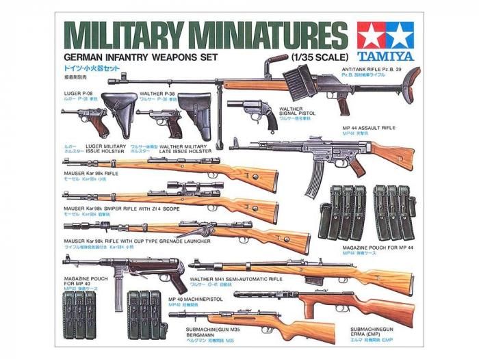 第二次大戦中、ドイツ軍が使用した各種の小火器を1/35スケールで精密にモデル化しました。ルガーP08やワルサーP38などのピストルやKar98K小銃やワルサーG41自動銃、MP40短機関銃やMP44突撃銃、Pz.B.39対戦車ライフル、MG34やMG42機関銃、そして対戦車兵器のパンツァーファウストや磁力地雷まで約20種類各2個をセット。機関銃用の対空三脚架や弾倉ケース、弾薬箱などのアクセサリーも豊富に用意しました。説明書には各兵器の詳しい性能や使用された期間の年表などを掲載。