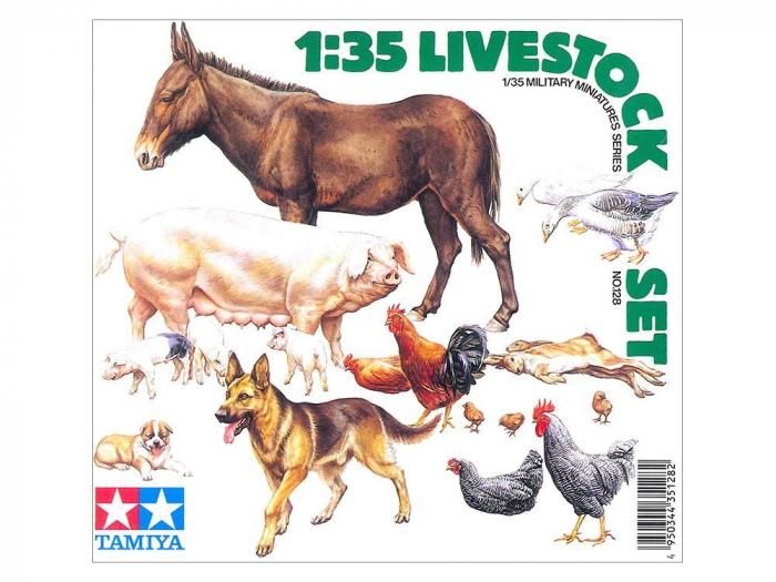 ミリタリーモデルに新しい情景作りの可能性を広げた動物セット。ラバ×1頭、シェパード×1匹、子犬×1匹、親豚×1頭、子豚×3匹、ニワトリが雄雌各2羽とひな鳥×3羽、さらにタマゴ×6個、がちょう×2羽、ウサギ×2羽がセットされています。