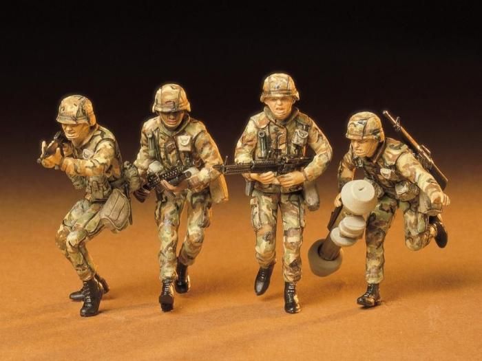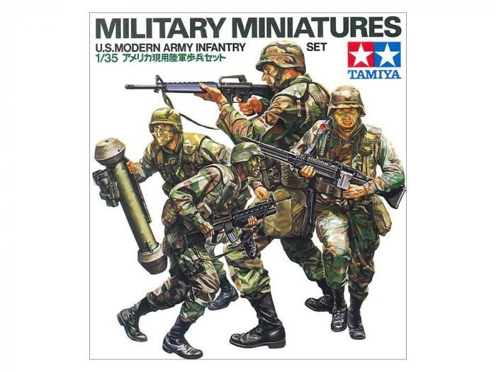 1980年以降のアメリカ軍歩兵を再現したプラスチックモデル組み立てキットです。ウッドランドカモフラージュパターンと呼ばれるコンバットスーツにボディーアーマやフリッツ・ヘルメットを装着したスタイルでモデル化しました。M203グレネードランチャー付きM16A1ライフルやM60機関銃、M47対戦車ミサイルドラゴンなどを手に進撃するポーズも迫力たっぷり。ビッグガンエイブラムスなどアメリカ現用戦車モデルと組み合わせての情景も楽しみです。