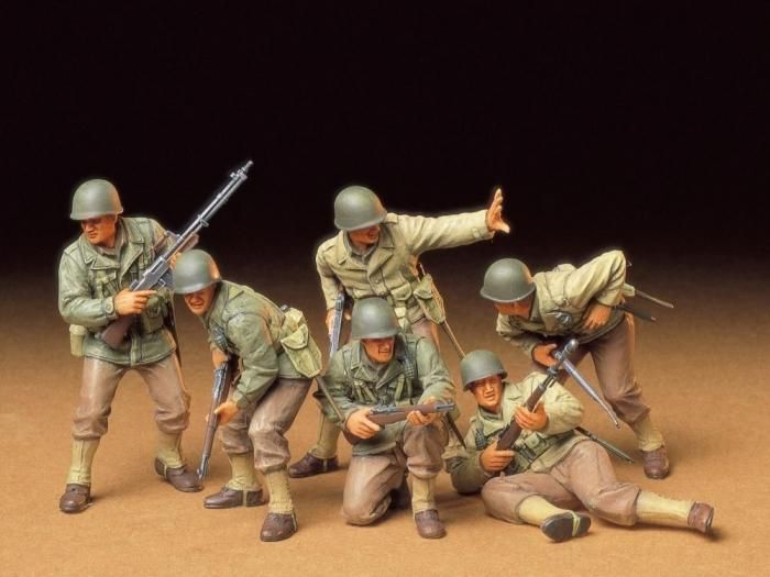 第二次大戦中のアメリカ軍歩兵を戦闘中のダイナミックなポーズで再現したプラスチックモデル組み立てキットです。下士官2名と兵士4体をセット。服装はM1941とM1943フィールドジャケットにキャンバスレギンスというスタイルでモデル化しました。後続する兵士に指示を出す下士官や物陰に身を潜め突撃のチャンスをうかがう兵士など緊迫感もたっぷり。M1ガーランドやトンプソンマシンガンなど火器類もシャープな仕上がりです。シャーマン戦車などと組み合わせての情景も楽しんで頂けるでしょう。
