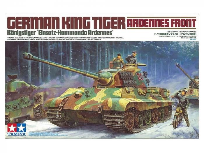 【 模型要目 】 ★第二次大戦末期のアルデンヌ戦線をイメージした、キングタイガーの1/35スケールプラスチックモデル組み立てキットです。★全長294mm、全幅108mm。★ヘンシェル砲塔を備える量産型の姿を高い実感で再現。★防盾パーツは段付きタイプと段のない滑らかな形状のタイプの2 種類を用意。★砲塔のエスケープハッチは可動式。他のハッチ類は全て開閉選択式です。★軍用オートバイDKW NZ350もセット。小型のヘッドライトや薄いフェンダーなど大戦後期に見られるタイプで再現しました。★Uボート乗員用の皮ジャケットを着用した伝令と戦車長、そして装填手の人形計3体付き。