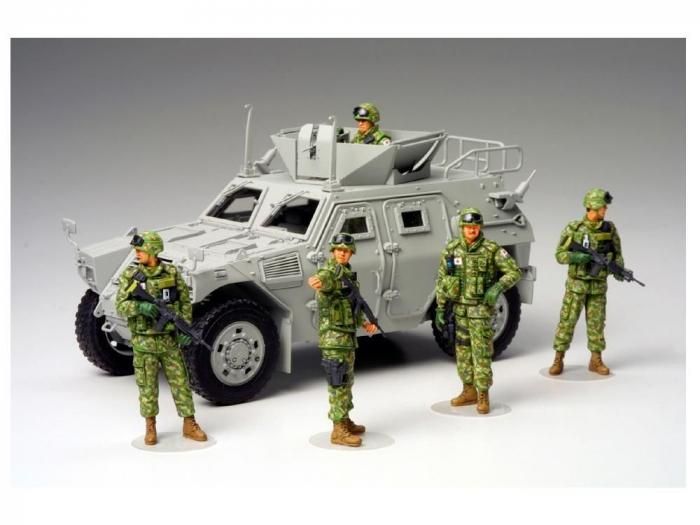 陸上自衛隊の最新装備となっている軽装甲機動車と組み合わせ、手軽に小情景が展開できるイラク派遣の陸上自衛隊員を再現したプラスチックモデル組み立てキットです。国内とは仕様の異なる防弾チョッキを着用した精悍な姿を実感豊かにモデル化。遠方を差し示し状況報告をするリーダーと報告を受けるコマンダーの2体、その周囲で89式5.56mm小銃を構え警備にあたる隊員2体、そして軽装甲機動車(別売)のルーフ上の銃塔に立つ機関銃手の計5体をセット。迷彩服の国籍マークはデカールを用意。アクセサリーとして89式5.56mm小銃とマガジンポーチ、小型マイクとレシーバー、双眼鏡、110mm個人携帯対戦車弾も付いています。