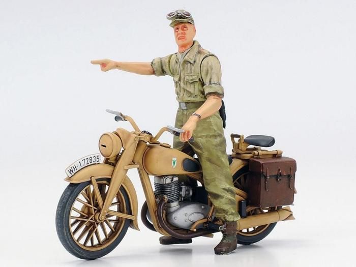 【 北アフリカ戦線の情景作りが楽しみ 】 第二次大戦中、幅広い戦線で偵察用に使われたドイツ軍の4輪装甲偵察車がSd.Kfz.222です。手榴弾よけのメッシュカバーを備えるオープントップ式の旋回砲塔に2cm砲を装備。出力90馬力の液冷ガソリンエンジンをリヤに搭載し、路上での最大速度70km/h、路外でも40km/hを発揮できました。名将ロンメル元帥率いるドイツ・アフリカ軍団にも配備され、その駿足ぶりを活かした偵察活動はもちろん攻撃任務にも度々出撃したのです。またDKW NZ350は11馬力単気筒2サイクルエンジンを搭載した中型軍用オートバイで、北アフリカ戦線でも連絡用などに使われました。
