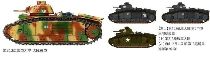 【 ドイツ軍が捕獲したフランス怪物戦車 】 フランス軍の主力戦車として第二次大戦勃発前の1937年に登場。1940年5月のドイツ軍によるフランス侵攻において、その強火力と重装甲でドイツ将兵の度肝を抜いたのがB1 bis戦車です。車体右前部に短砲身75mm榴弾砲、小型の鋳鋼製砲塔に47mm戦車砲を搭載し、防御装甲は当時最強の60mmを誇りました。フランス制圧後はドイツ軍が自軍への配備を進め、無線機や車載工具はドイツ式に改められました。また新たにフランス軍のジャッキなどを装備し、砲塔上の視察用ドームにハッチを増設、車体前部にコンクリートブロックを追加した車輌も見られました。ドイツ軍のB1 bisはドイツ占領下のチャンネル諸島に駐留、ロシア戦線では要塞攻略などに奮戦したのです。