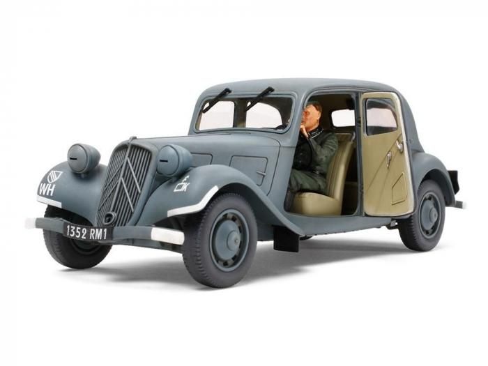 【 模型要目 】 歴史的な傑作乗用車シトロエン11CVのプラスチックモデル組み立てキットです。 ●1/35スケール、全長125mm、全幅48mm。やわらかな曲線で構成されたボディや前後フェンダーの持つ優雅なフォルムを表情豊かに再現。 ●左右フロントドアは開閉選択式で幅広い情景設定に対応。 ●室内もダッシュボードや前後シートなどに繊細なモールドを施しました。 ●足まわりも組み立てやすいパーツ構成で立体感あふれる仕上がり。 ●着座姿勢のドライバー人形付き。 ●デカールはドイツ陸軍2種とフランス軍所属車に加え、フランス民間車の4種類をセット。