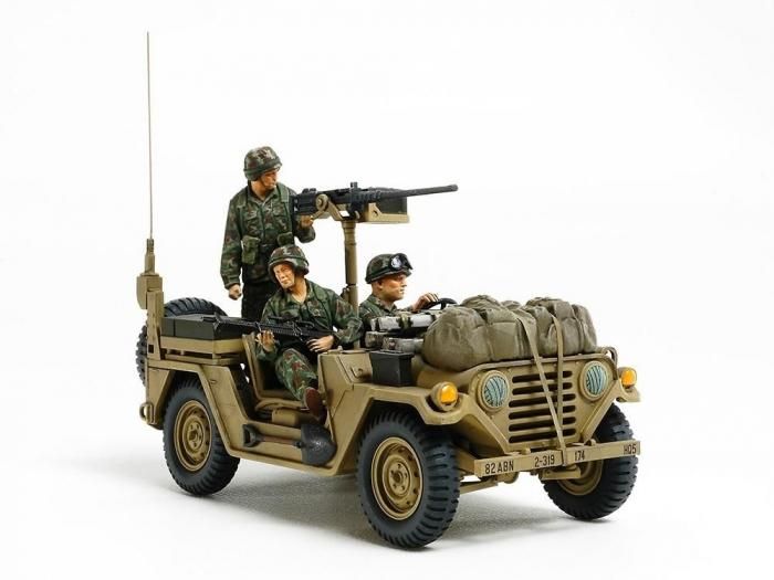 【 模型要目 】 M151A2のプラスチックモデル組み立てキットです。 ●1/35スケール、全長98mm、全幅48mm。 ●搭載武装をM60機関銃からM2重機関銃に強化し、ボンネットに荷物を満載した姿を迫力十分にモデル化。 ●折りたたみ簡易ベッドやバッグ類、弾薬箱などの装備品をセット。 ●臨場感あふれる兵士の人形3体付き。ヘルメットはPASGTヘルメットとM1ヘルメットを選択可能。 ●第82空挺師団と第2レンジャー大隊のデカール2種類付き。