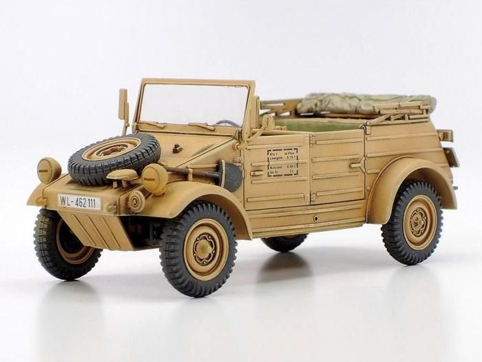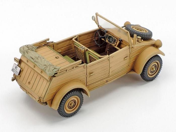 【 Pkw.K1 キューベルワーゲン82型について 】 第2次大戦中、ドイツ軍があらゆる戦線で連絡や偵察、兵員輸送などに活用、空軍でも搭乗員や将兵の足として使われたのがキューベルワーゲンです。ドイツの国民車として計画されたフォルクスワーゲンをベースに開発され、シンプルで軽量な車体構造に加え、信頼性の高い空冷エンジンと4輪独立のサスペンションにより優れた走破性を発揮しました。