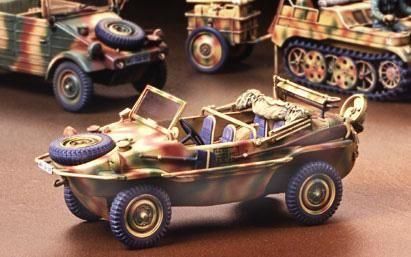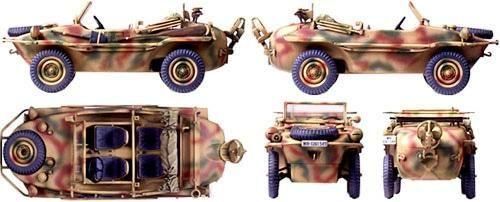 【 Pkw.K2s シュビムワーゲン166型について 】小型軍用車キューベルワーゲン82型の水陸両用車としての潜在能力を開発当初から認識していた ポルシェ博士 は、1940年11月に密閉船体形の試作車シュビムワーゲン128型を製作。各種テストの結果を受けて、1941年夏にはホイールベースを2,000mmに短縮した高性能な4人乗り小型水陸両用車、シュビムワーゲン166型を完成させたのです。車体後部に25馬力の空冷4気筒1,130ccエンジンを搭載し、前進4段、後進1段の2輪駆動走行と超低速ギヤでの4輪駆動走行も可能。最高速度は80km/hを発揮しました。