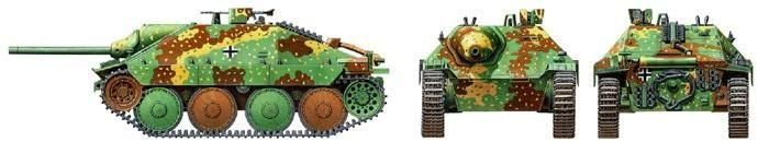 【 ヘッツァー 中期生産型について 】 全面に傾斜装甲を備えたコンパクトな車体に強力な48口径7.5cm対戦車砲を搭載。それまでのドイツ対戦車自走砲や突撃砲などの発展型とも言えるのが駆逐戦車ヘッツァーです。信頼性の高いチェコ製38(t)戦車のコンポーネントを流用して短期間で開発され、1944年4月から大戦終結までに2800輌以上を生産。大戦後期の主力駆逐戦車として東西両戦線で戦車部隊の一翼を担ったのです。