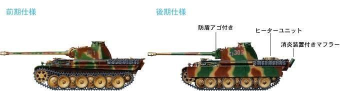 【 パンサーG型の改良 】 1944年の後半からはパンサー戦車にも戦訓を採り入れた改良が施されました。主砲防盾下部に命中した砲弾が跳ねて車体上部に直撃するのを防ぐためアゴ付きとなった防盾や、夜間走行中の排気炎を防止する消炎装置付き排気管、エンジングリル上には冬季用の室内ヒーターユニットも取り付けられ、主力戦車としての完成度を一段と高めたのです。