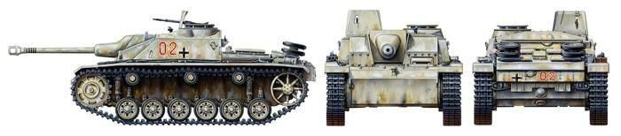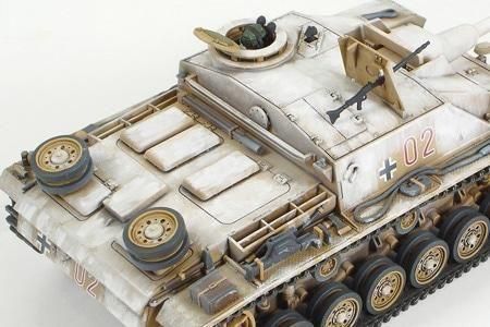 【 ロシアでの激闘に鍛えられた長砲身 】 第二次大戦でドイツ軍が使用した突撃砲の中で、最も多く生産されたのがIII号突撃砲です。1942年末に登場した最終生産タイプのG型は、突撃砲の主任務が当初の歩兵支援から対戦車戦へと変化したため主砲を強力な長砲身48口径7.5cm砲に換装。生産途中から追加装甲板シュルツェンやキューポラ基部の跳弾板、ザウコプフと呼ばれる鋳造製防盾も追加され、大戦終結までに7,893輌が生産されました。III号突撃砲G型はその火力と扱いやすさを活かして東西両戦線で奮闘し、砲兵でありながら多数の騎士十字勲章受章者を輩出したのです。