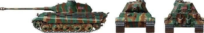 【 力強さと優美さを兼ね備えた初期型砲塔 】 第二次大戦の終結も近い1944年にドイツ最後の量産型重戦車として登場したのがキングタイガーです。車体前面で150mm、側面80mmという重装甲の車体に、タイガーI よりもさらに強化された71口径88mm砲を装備して連合軍将兵を震え上がらせたのです。最初に生産された50輌にはポルシェ社設計の砲塔が搭載され、その曲線的なフォルムが特徴となっています。1944年6月、ポルシェ砲塔装備のキングタイガーは最初のキングタイガー部隊としてノルマンディーに上陸してきた連合軍を迎え撃ったのです。