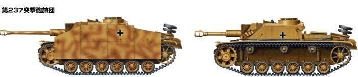 【 精悍なフォルムを引き立てる角形防盾 】 第二次大戦でドイツ軍は無砲塔型式の突撃砲を数多く使用しました。中でも最も多く生産されたのがIII号戦車の車体を利用したIII号突撃砲です。1942年末に登場したG型は対戦車戦向けに強力な長砲身7.5cm砲を搭載。初期の生産タイプでは武骨な溶接構造の防盾を装着していました。また7.5cm砲に代えて10.5cm榴弾砲を搭載した突撃榴弾砲も並行して生産され、突撃砲大隊などに分散配置されて大きな働きを見せたのです。