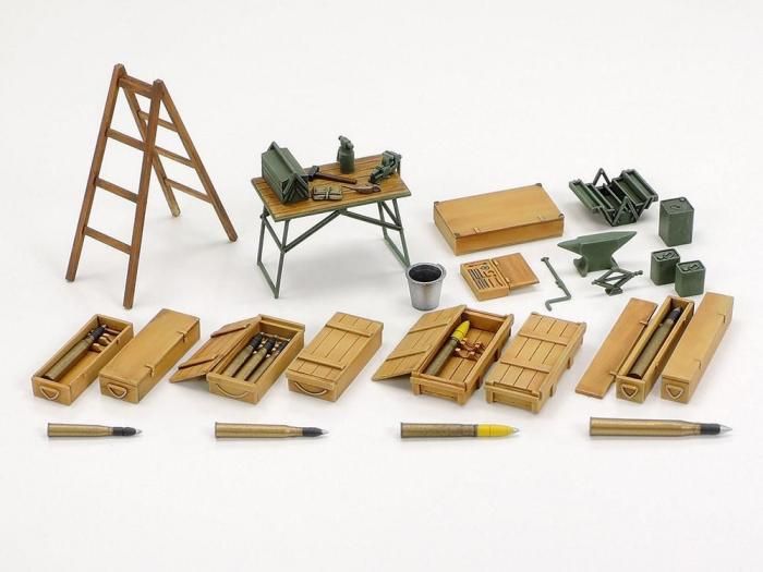 【 整備・補給シーンの情景作りが楽しみ 】 第二次大戦中、ドイツ軍は早くから戦車を中心とした戦術を用い、数多くの戦闘車輌や支援車輌が投入されました。しかし整備施設のない最前線で損傷した車輌の回収、修理をいかに迅速に行うかが課題となり、専門の整備部隊が編成されて戦闘部隊と行動を共にしました。また、大規模な修理以外の砲弾や燃料の補給など、日常的な整備は各車輌の搭乗員が行いました。