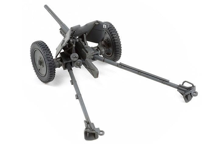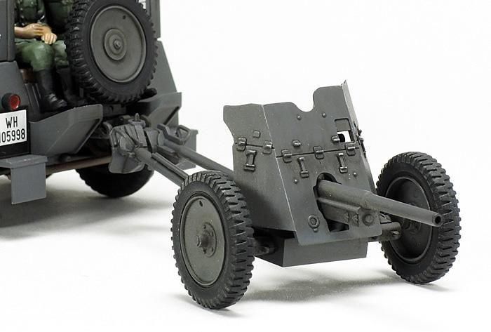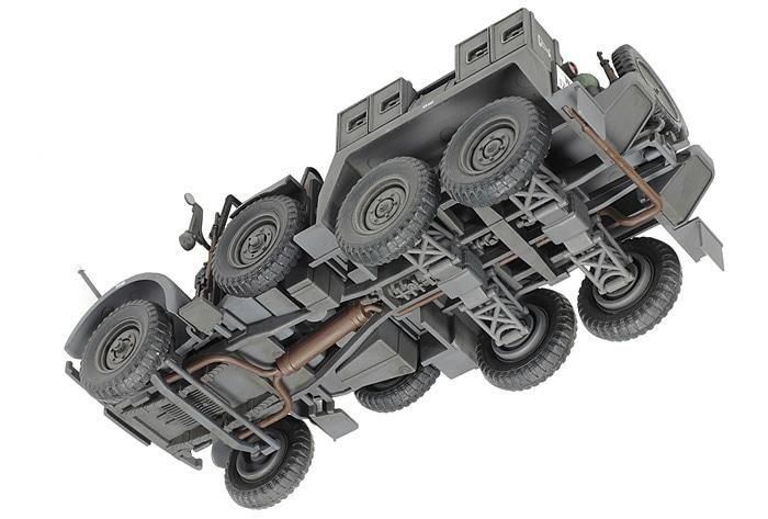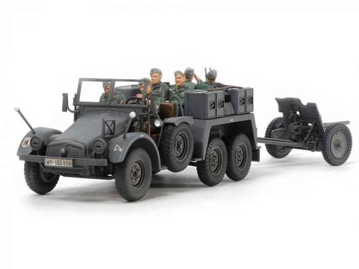 【 対戦車砲チーム、進撃せよ! 】 第二次大戦中、様々な用途に使用されたドイツ軍の6輪トラック。その中でも3.7cm対戦車砲など火砲の牽引に使用されたタイプがKfz.69です。コンパクトな空冷4気筒水平対向ガソリンエンジンと後4輪がダブルウィッシュボーンの独立サスペンションを備え、優れた走破性を発揮。定員は6名で、車体後部の両側には弾薬収納箱が装備されていました。各師団の対戦車砲大隊に標準配備されたKfz.69は、対ポーランド戦やフランス戦、バルカンやロシア戦線など、大戦前期の各戦線で幅広く使用されました。また3.7cm対戦車砲は大戦初期のドイツ軍を代表する対戦車砲でした。