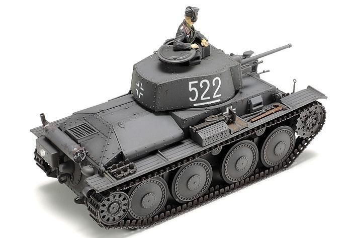【 ドイツ軍を支えたチェコ製戦車 】 1939年にチェコスロバキアを併合したドイツは、チェコのCKD社が開発したLTvz.38軽戦車の高性能に着目。これを38(t)戦車として制式採用しました。主砲は3.7cm砲を装備、装甲にはリベット留めを採用し、125馬力のエンジンにより最大速度は42km/h。改良を加えながらA型からG型まで生産され、大戦初期のドイツ軍主力戦車の一つとして活躍しました。中でも1940年11月から約1年間生産されたE/F型は戦訓により防御力を強化したタイプ。1941年6月からの独ソ戦初期に数多く投入されました。