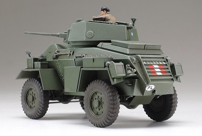 【 戦場を駆け巡った俊足の猟犬 】 第二次大戦中に幅広く使われたイギリス軍の装輪装甲車が7トン4輪装甲車です。傾斜装甲で構成された車体に90馬力のエンジンと4輪駆動の足まわりを備え、最大速度は72km/hを発揮。Mk.IからMk.IVまでが開発され、Mk.IIでは車体装甲を改修、Mk.IIIでは容積を拡大した砲塔を採用し、最終型のMk.IVでは武装が従来の15mm機関砲から37mm砲に強化されました。総計で3,600輌以上が生産され、Mk.IVはシリーズ最多の約2,000輌が完成。大戦後半の北西ヨーロッパ戦線やイタリア戦線などに配備され、軽快な機動力を活かして指揮・偵察任務に大きな働きを見せました。