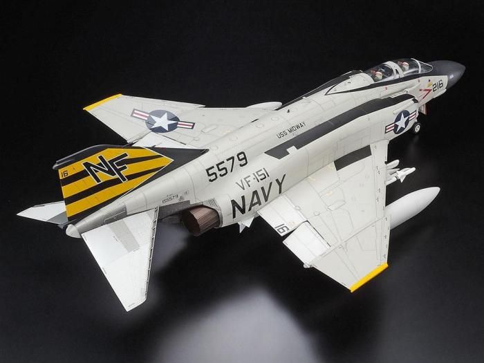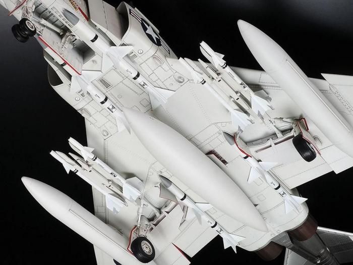【ベトナムで実力を証明、ファントム海軍型】 アメリカ海軍に加えて空軍でも主力戦闘機となり、さらにはイギリスや旧西ドイツ、イスラエルや日本など11ヶ国が採用。総計5,000機以上が生産され、30年近くにわたって自由主義世界の最良の戦闘機として空の護りについてきたのが、F-4ファントムIIです。その初飛行は1958年のことで、アメリカ海軍に制式採用されると共に、速度記録や高度記録、上昇力など航空機の世界記録を次々と塗り替え、高性能を立証したのです。F-4Jは、初期生産型のA型、最初の量産型のB型とその改修型のG型に次いで海軍用として開発されたタイプです。すでに空軍でも採用されていたC型、D型の改良点と共に、海軍独自の要求に基づいて各部を強化、1966年5月に初飛行しました。エンジンをバワーアッブし、レーダーや火器管制装置、爆撃管制装置を高性能化して空戟能力や対地攻撃能力を向上させ、さらに自動着艦を可能とするなど扱いやすさも高められました。そして1967年3月から部隊配備が始められ、1972年12月までに522機が生産されました。F-4Jの活躍の舞台となったのはベトナム戦争でした。1968年5月末から続々と実戦に投入されて北ベトナムに向かう地上攻撃機隊の護衛を主な任務とし、マッハ2.2の最大速度、すぐれた空戦能力そして強力な武装を生かし、アメリカ海軍の戦闘機としてベトナム戦争で唯一のエースを生み出したのをはじめ、ミグ17やミグ21戦闘機との空戦に多くの戦果を残したのです。