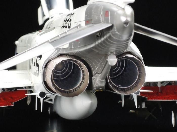 【海兵隊も認めた実力の翼】 総計5,000機以上が生産され、アメリカ海と海兵隊、そして空軍に加えてイギリスや日本など世界11ヶ国が採用、30年以上にわたって自由主義諸国の空の護りについたのがF-4ファントムIIです。その初飛行は1958年のことで、アメリカ海軍の艦載戦闘機として制式採用されると共に、速度記録や高度記録など航空機の世界記録を次々と塗り替え、優れた塞本性能を実証しました。F-4Jは、最初の量産型となったB型や12機のみ生産されたG型に続いて海軍用として開発されたタイプで、1972年12月までに522機が生産されました。エンジンを従来のJ-79GE-8から改良型のJ-79GE-10に換装し、レーダーや火器管制装置、爆撃管制装置の強化により迎撃能力や対地攻撃能力も向上、またASW-11データリンクシステムの搭載により自動着艦も可能となり、扱いやすさも高められました。部隊配備は1967年に開始され、1968年5月末からは激しさを増していたベトナム戦争に続々と投入されました。第212や232戦闘攻撃飛行隊などベトナムに展開していた海兵隊飛行部隊もF-4Jを装備、Mk.82などの通常爆弾やサイドワインダーなどを搭載して主に海兵隊地上部隊の近接支援に実力を発揮しました。海兵隊のF-4Jは北ベトナム空軍機との交戦の機会は多くありませんでしたが、第333海兵戦闘攻撃隊のL.T.ラシッター少佐とJ.D.カミングス大尉の搭乗するF-4Jは1972年9月、ミグ21戦闘機の撃墜に成功しました。