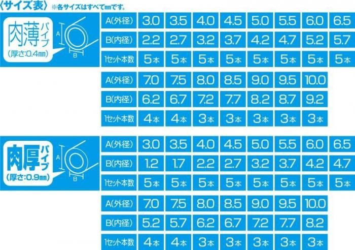パイプ外径は使いやすいピッタリサイズ(3.0/3.5/4.0/4.5/5.0/5.5/6.0/6.5/7.0/7.5/8.0mm) としました。