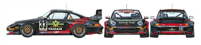 1995年の全日本GT選手権でシーズン6戦中3勝を上げたポルシェ。中でもタイサンチームのマシンを再現したプラスチックモデル組み立てキットです。両端が持ち上がったユニークな形のフロントスポイラー、大型のリヤウイング、そして前後にオーバーフェンダーを付けたレーシーなフォルムをリアルに再現。さらにフロント・ストラット、リヤ・マルチリンクの足まわりや、ロールケージに囲まれた室内なども実感たっぷりにモデル化。アンダートレイは透明パーツですから、装着後もメカを見ることができます。スライドマークはカーNo.33と35の2種類をセットしました。