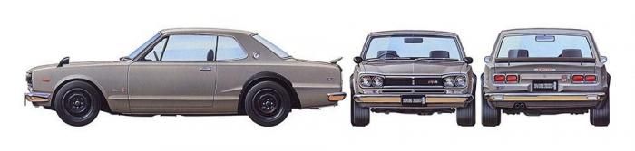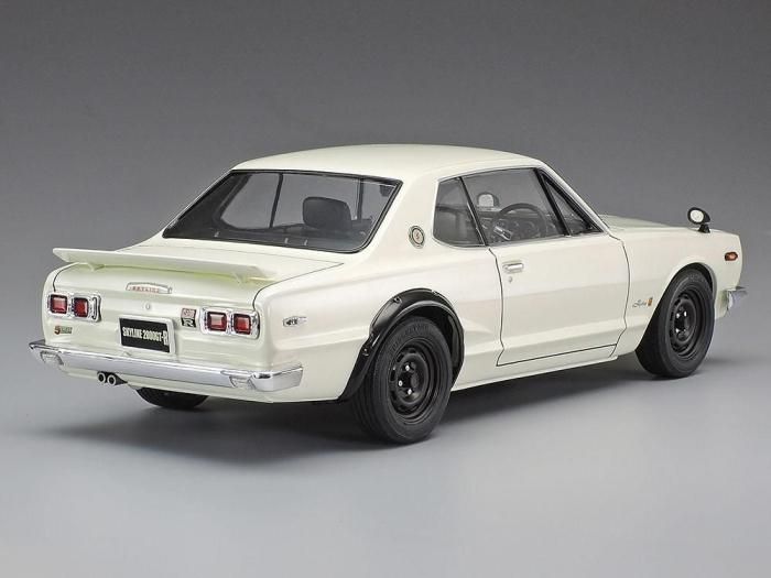 【 GT-R神話を語る上で忘れることのできないKPGC10型のモデル 】 1970年に登場し、「箱スカ」の愛称で今も多くの熱狂的なファンを持つスカイライン2000GT-Rのプラスチックモデル組み立てキットです。直線的なラインで構成されたフォルム、ボディサイドのサーフィンライン、GT-Rの特長でもあるリヤ・オーバーフェンダー、そしてオプションのリヤスポイラーも装備した精悍なスタイルを実車に忠実にモデル化。開閉式のボンネットの中には精密に再現されたDOHC直列6気筒のS20型エンジンが収まります。また前後のサスペンションやスパルタンな室内も立体感あふれる仕上がり。フロントグリルをはじめ前後のバンパーやドアノブなどはメッキパーツで再現され、仕上がりを引き締めます。