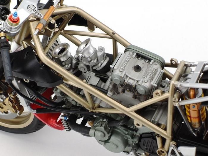 【 イタリアンセンスあふれるフォルムを模型で味わってください 】 1993年のミラノショーで発表されたドゥカティのトップモデル、916を再現したプラスチックモデル組み立てキットです。2灯式ヘッドライトを採用した個性的な表情を見せるフロントカウル、独特の形状のタンク、2本のサイレンサーを抱きかかえるようなシートカウルなど、微妙なラインまで実車そのままにモデル化しました。美しいパイプトラスフレームに極小ビスで取り付けるLツインエンジンも精密な仕上がり。大口径のエアファンネルが高性能を感じさせます。さらにユニークな取り回しの2本の排気管、湾曲したラジエター、オイルクーラーなど補機類や各種のパイピングもリアルに再現しました。