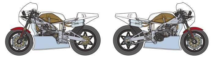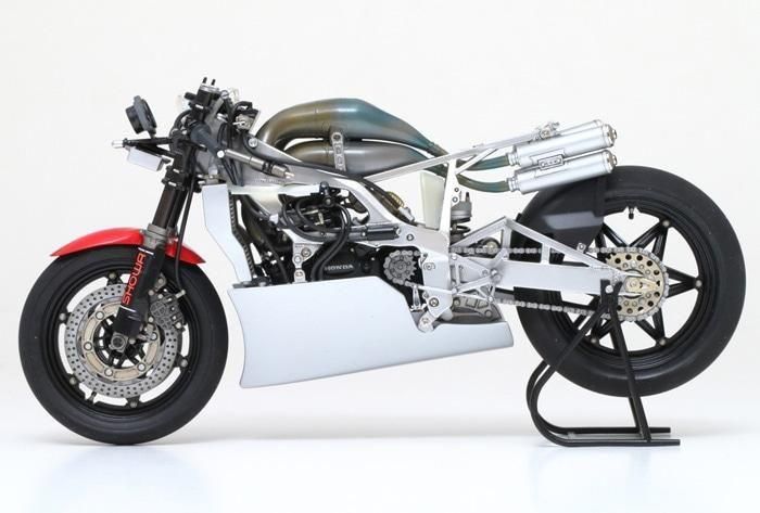 【 模型要目 】 ●全長166mm、全幅52mm。フレディ・スペンサー選手のライディングで優勝をとげた前期型を再現。 ●エンジンの上にチャンバー、下に燃料タンクを配置した独創の車体構成を実車そのままに再現。 ●4本のチャンバーは2本を1組としてビスで確実に取り付けられます。 ●1軸クランクV型4気筒エンジンも精密な仕上がり。 ●アルミフレームや複雑な形状の燃料タンクもリアルにモデル化。燃料タンクは脱着可能。 ●独特の燃料系配管をはじめ、アクセル、クラッチなどのワイヤリングはビニールパイプで表現。 ●カウリングやチャンバーカバー、シートカウルは極小ビスにより取り付け。 ●リヤサスペンションには金属製スプリングを使用。 ●レーシングスタンド付き。 ●スライトマーク、塗り分け用マスキングシールもセット。