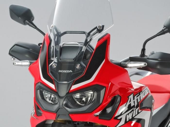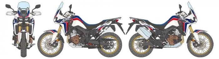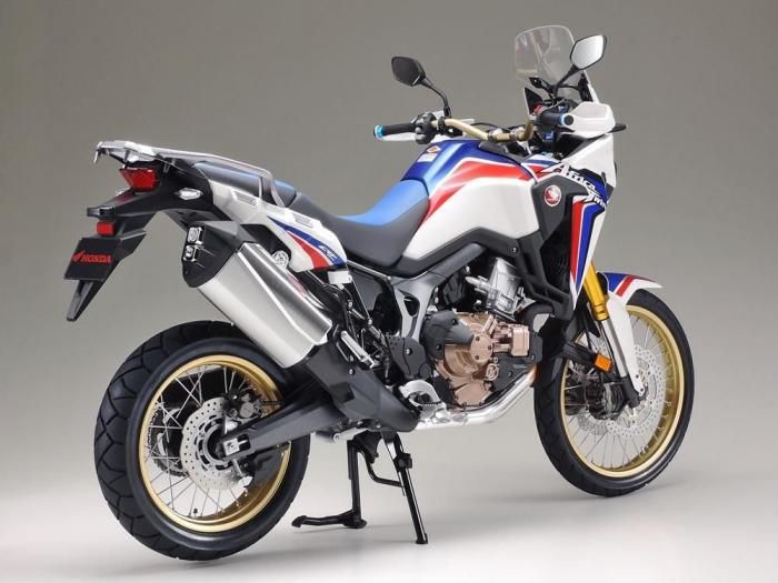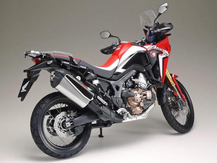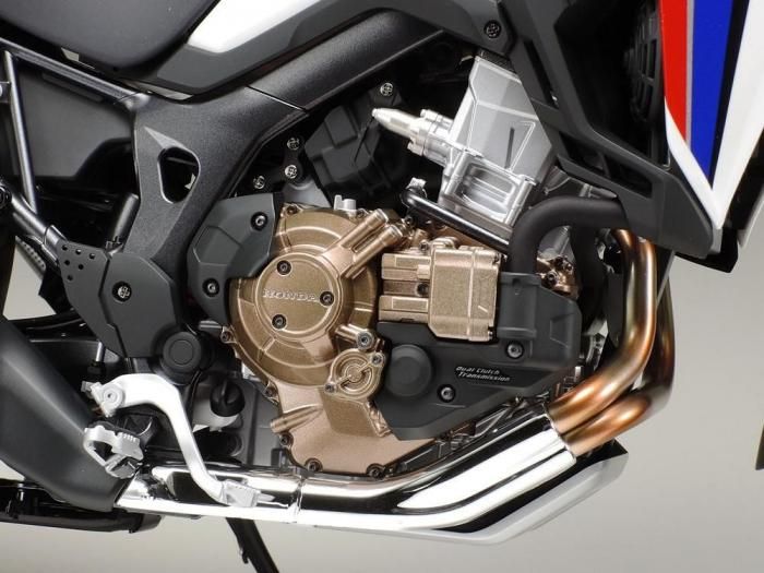 【 模型要目 】 Hondaのアドベンチャーバイク、CRF1000L アフリカツインを再現したプラスチックモデル組み立てキットです。★1/6スケール。完成時の全長390mm、全幅158mm、全高255mm(センタースタンド使用時)。★ボリューム感あふれるスタイルを実車に忠実にモデル化。★金属シャフトやビス止めを多用して確実な組み上がりと強度を確保。★排気量998cc水冷4ストローク直列2気筒エンジンは、上部のエアボックスやラジエターなどの補機類まで精密にモデル化。★点火コードをはじめ、アクセルやブレーキなど各種のケーブルはビニールパイプを用意。★タイヤはトレッドパターンもリアルな質感ある中空ゴム製。★サイレンサーやエキゾーストパイプのカバーなどはメッキ部品。★リヤダンパーは金属シャフトとスプリングを使用して可動。★フロントカウルのエンブレムにメッキパーツを使用して立体感を表現。★ブレーキランプはクリヤーレッド、ウインカーはクリヤー、リフレクターはクリヤーオレンジパーツで再現。