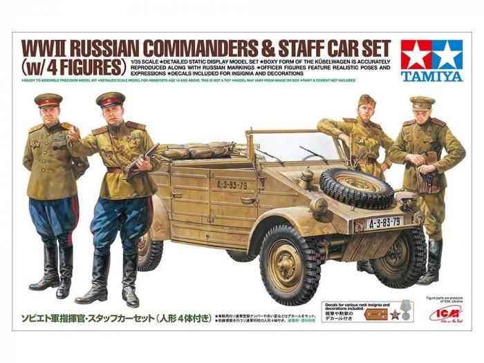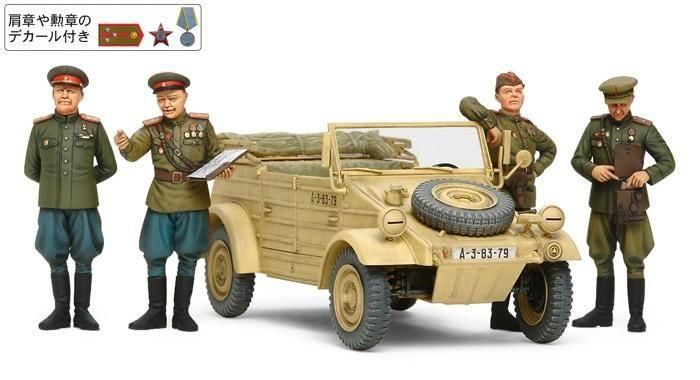 【 ベルリンを目指すソ連軍指揮官 】 前線視察中のソ連軍将校の人形4体に、スタッフカーとして使用されるキューベルワーゲンをセットしたプラスチックモデル組み立てキットです。 ●1/35スケール。将校は1943年以降に制式化されたルパシカ型野戦服や5つボタンの制服、将校帽やピロートカと呼ばれるサイドキャップを着用した姿で再現。 ●尉官から将軍までの肩章、レーニン章や親衛章など手描きでは難しい勲章類はデカールを用意。ソ連軍将校の華やかな軍装を手軽に再現できます。 ●キューベルワーゲンの全長110mm。平面構成の機能的な姿をリアルに再現。 ●ソ連軍登録ナンバーや赤い星などのデカール付き。※人形パーツはICM社製