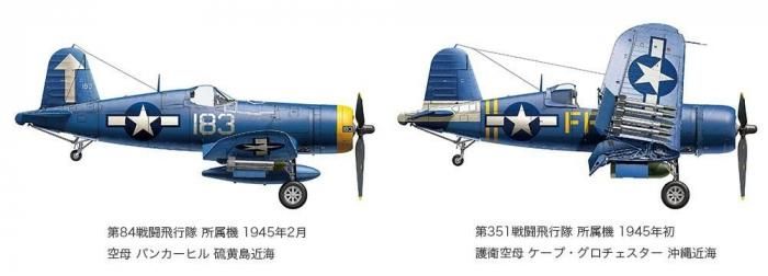 【 空母部隊の一翼を担った戦闘爆撃機型 】 第二次大戦の後半、高速性能と重武装で日本軍を圧倒したアメリカ海軍のコルセア。その中でも1944年4月に初めて空母艦載機として正式採用されたのがF4U-1Dです。窓枠のないセミバブル型キャノピーや付け根から太くなったプロペラ、視界改善のために位置を高めた操縦席などが特徴。翼内の12.7mm機銃6挺に加えて、内翼下面2ヶ所のパイロンに合計2,000ポンドまでの兵装類や落下タンク、さらに外翼にロケット弾8発の装着が可能。1945年2月にはアメリカ艦載機として初めて日本本土攻撃を行うなど、空母部隊の一翼を担いました。