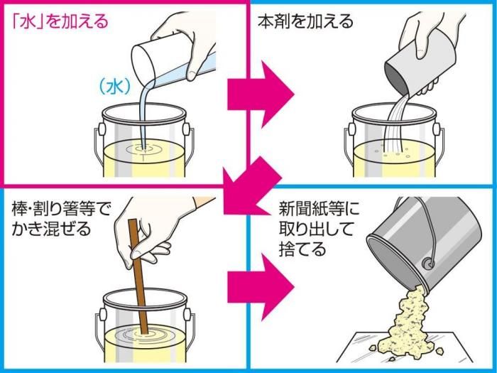 ・エナメル塗料、レジンキャスト、離型剤落とし液等は、油性塗料と同様に水を混ぜて固化させてください。