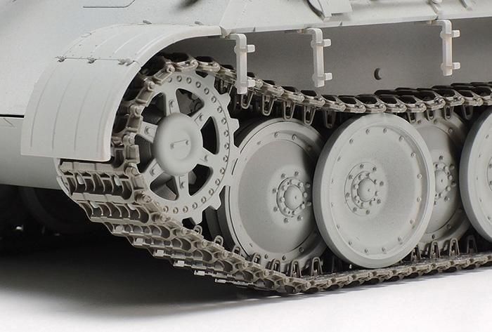 【 垂れ下がりを再現して見ごたえをアップ 】 キット付属のベルト式履帯に換えて使用する、パンサーD型専用の組み立て式可動履帯セットです。接地面に刻まれた滑り止め用の2箇所の凹みを表現し、またセンターガイドの軽め穴を再現するためにこの部分を別パーツ化し、本体に接着する方法を採用。接着後はスナップフィットで簡単に連結できます。自重で垂れ下がった状態の再現など、リアルな履帯の表情がパンサー戦車の完成度を高め、情景設定の幅も広げます