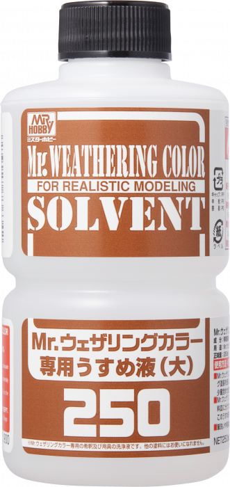 Mr.ウェザリングカラーシリーズ、Mr.ウェザリングペースト、一部YAKUMOカラー専用のうすめ液。ウェザリングカラーの拭き取りや、粘度調整、洗浄にご利用いただけます。