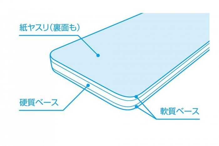 ヤスリスティック本体は、芯になる中央部には硬質ベースを、その上下を軟質ベースではさんだ3層構造とし、両面に紙やすりをセットしました。 ヤスリスティック本体はお好みの形に切り出すことができ、作業場所にあわせた形状に加工することができます。