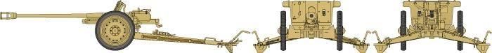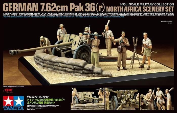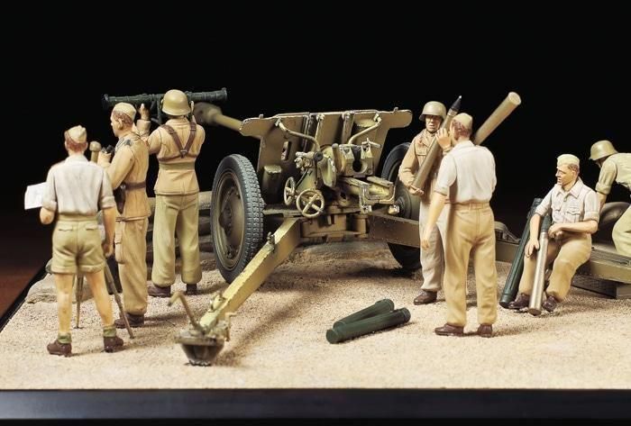 【 北アフリカ戦線の対戦車砲陣地を再現 】 1941年6月に始まった独ソ戦初期、快進撃を続けるドイツ軍は大量の軍事物資や兵器をソ連軍から捕獲。その中には1,000門以上の7.62cm野砲F22も含まれていました。T34やKV-1など強力なソ連軍戦車に悩まされていたドイツ軍は、F22をより貫通力の高い対戦車砲に改造、Pak36(r)として制式採用したのです。その威力は徹甲弾Pz.gr.39を使用した場合で、角度60度・厚さ98mmの装甲板を500mの距離から貫通できました。Pak36(r)はロシア戦線はもとより遠く北アフリカ戦線にも送られ、イギリス軍マチルダ戦車を数多く撃破するなどアフリカ軍団の危機を度々救う活躍を見せています。またPak36(r)は対戦車自走砲マーダーIIIなどの主砲としても搭載されました。