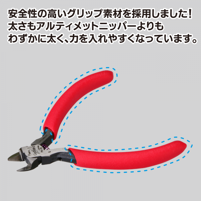 ・刃折れ防止ストッパー ・開き過ぎ防止ピン ・バネ付き ・ソフトグリップ ・オリジナルニッパーキャップ(ホック付)付属