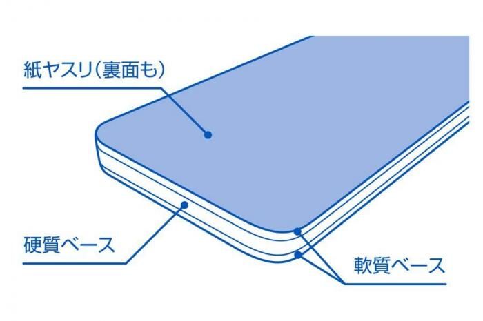 ヤスリスティック本体は、芯になる中央部には硬質ベースを、その上下を軟質ベースではさんだ3層構造とし、両面に紙やすりをセットしました。