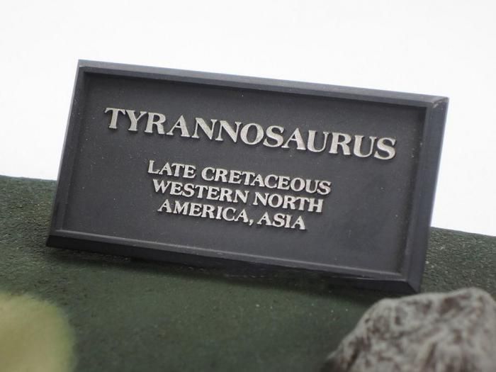 《 ティラノサウルスについて 》 最大最強の肉食恐竜といわれるティラノサウルスは、恐竜時代の終わり頃、7500万年〜8000万年ほど前の白亜紀と呼ばれる時代の後期に、今の北アメリカやアジアに生きていました。体長は13m前後にもなり、太い尾をピンと伸ばしてバランスをとりながら、がっしりとした2本の後足で歩き、走れば時速30〜40kmは出せただろうと考えられています。鋭い歯がずらりと並んだ大きな口を武器にして、カスモサウルスやパラサウロロフスなどの草食恐竜を襲っていました。