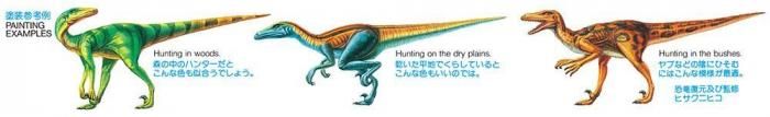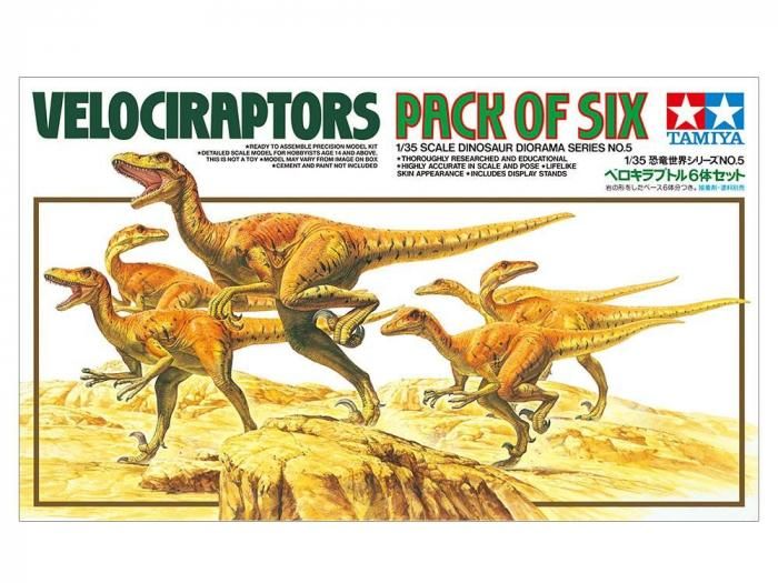 【 模型要目 】 白亜紀末期にアジアから北アメリカにかけて広く生息した小型の肉食恐竜、ベロキラプトルを再現した1/35スケールのプラスチックモデル組み立てキットです。★完成時の体長100mm。★特徴的な後足の切り裂き用のツメまで再現。★口を開ける、飛びかかるなど3種類の基本スタイルに、3種類の手足を組み合わせることで、6体それぞれが異なったポーズで組み立てられ、集団で狩りをするシーンが楽しめます。★岩をイメージした6体分のミニスタンド付き。