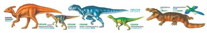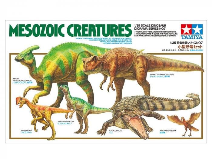 【 模型要目 】 太古の世界に生きていた小型の恐竜たちを再現した1/35スケールのプラスチックモデル組み立てキットです。★最強の肉食恐竜ティラノサウルスと草食恐竜のパラサウロロフスは青年期の姿をモデル化。★ヒプシロフォドンは白亜紀の代表的な小型草食恐竜。オビラプトルは卵を食べていたともいわれるユニークな恐竜です。★現在までほとんど姿を変えずに生きているワニや、鳥の祖先といわれる始祖鳥もセット。