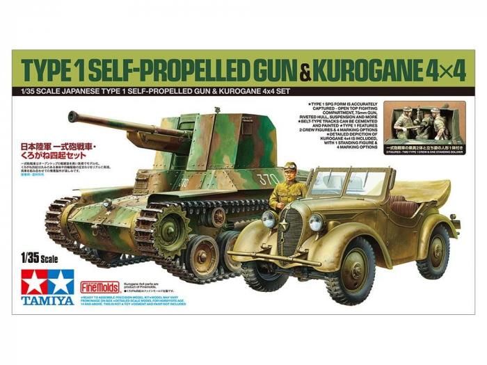 【 模型要目 】 日本軍の自走砲、一式砲戦車とくろがね四起をセットにしたプラスチックモデル組み立てキットです。●1/35スケール。一式砲戦車の全長170mm。くろがね四起の全長102mm。●一式砲戦車は75mm野砲を搭載した力強い姿を実感豊かにモデル化。●リベット接合式の車体や独特な配置のサスペンションなどもリアルに再現。●主砲装填部やオープントップの戦闘室内部も立体感あふれる仕上がり。●履帯は接着・塗装可能なベルト式。●砲手と装填手の人形2体、デカール4種類付き。●砲弾と薬きょうなどのアクセサリーも用意しました。●くろがね四起は丸みのある3座席の車体や四輪駆動の足まわり、大径タイヤなど特徴をとらえてモデル化。●幌は折りたたんだ状態で再現。●立ち姿の人形1体とデカール4種類をセットしました。●両車を組み合わせての情景製作も楽しみ。※くろがね四起と立ち姿の人形はファインモールド社製です。