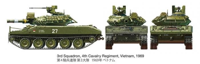 【 革新の空挺戦車で飾るMMシリーズ50周年 】 水上浮航や輸送機からの空中投下が可能な空挺戦車として、1959年から開発が進められたのがアメリカ軍のM551シェリダンです。軽量化のため車体をアルミ合金製とし、主砲には通常弾に加えシレイラ対戦車ミサイルも発射できる152mmガンランチャーを装備するなど当時の最新技術を導入し、1966年5月に制式化。同年6月から1970年11月までに1,600輌以上が生産されました。ベトナム戦争中の1969年1月に初めて実戦に投入され、強力な多目的榴弾を使用した陣地攻撃などに威力を発揮。戦訓により車体前部底面などに対地雷用の増加装甲を施し、車体前面に対戦車ロケット弾対策のワイヤーネットを装備した車輌や、キューポラにM113 ACAV用の大型ガンシールドを装着した車輌なども見られました。