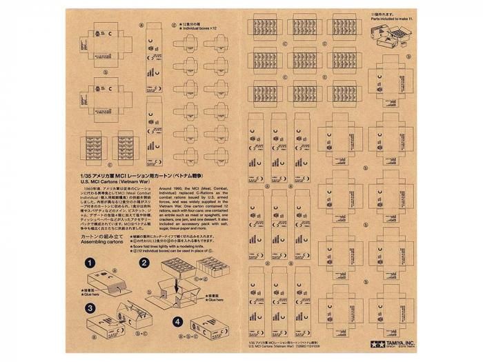 【 車載から情景製作など幅広く使えるレーション用カートン 】 ベトナム戦争中から米軍兵士に供給が開始されたMCI(個人用戦闘糧食)を紙で再現しました。12種類の小箱を収めたカートンとスリーブで構成。カートンからスリーブを外して小箱が見える状態にすることはもちろん、小箱を取りだした状態にすることも可能です。組み立て式。カートンは11個用意しました。シェリダンなどの車載アクセサリーとして、また情景製作にも幅広く使えます。
